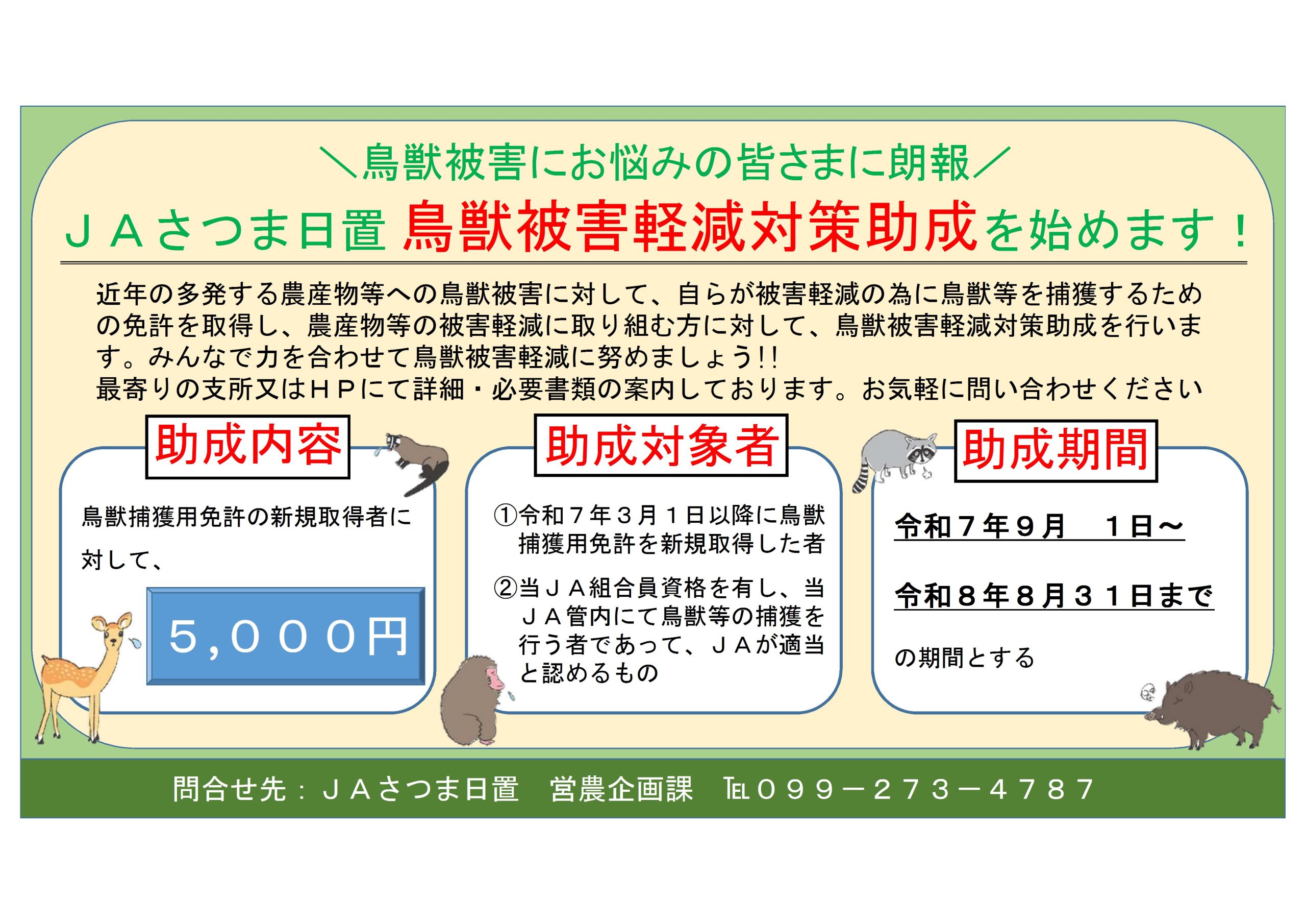 JAさつま日置 鳥獣被害軽減対策助成の制定について