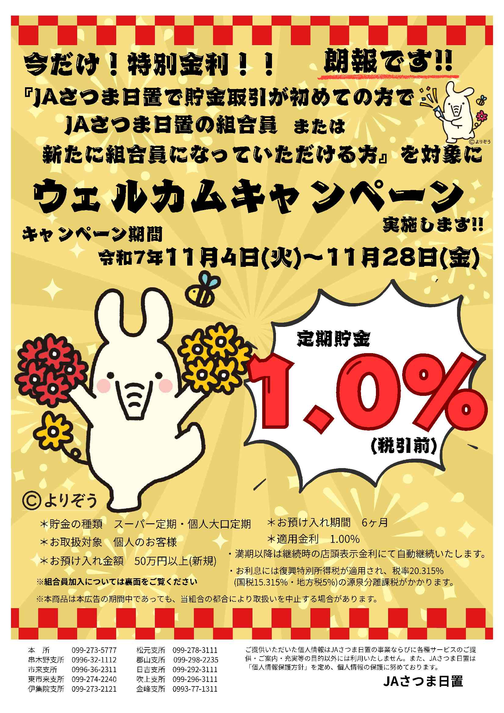 JAさつま日置は「当JAで貯金取引が初めての方で、当JAの組合員または新たに組合員になっていただける方」を対象