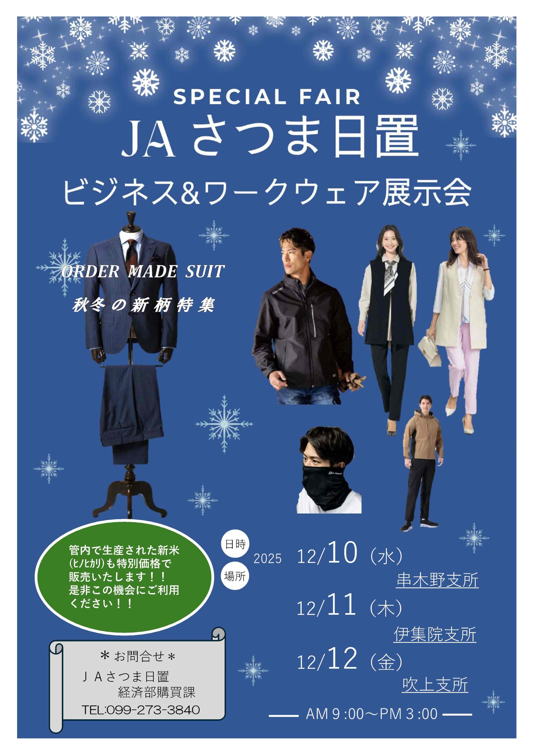 JAさつま日置は12月10日(水)〜12日(金)にかけて、ビジネス&ワークウェア展示会を開催いたします。