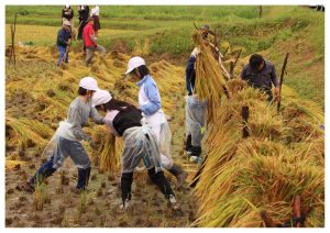 下養母自治会や養母の里づくり委員会、JAさつま日置青年部東市来支部が協力。5月に手植えした約6㌃の稲を、泥まみれになりながら鎌とバインダーで収穫しました。
